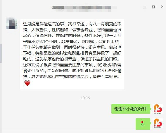 向姐非常的貼心周到,我和寶寶都很依賴她~她技術(shù)專業(yè),而且總是滿臉笑容,給我很大的鼓勵~現(xiàn)在她下戶了,我們家里都非常舍不得她。謝謝向姐,希望向姐以后一切順利一直幸福。也謝謝你們公司其他工作人員,祝你們公司越來越好。