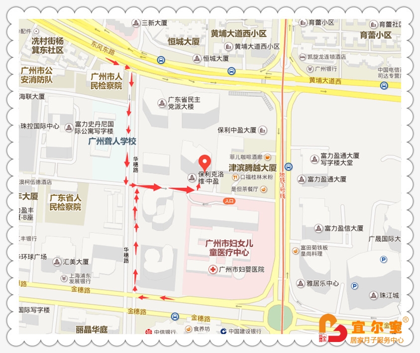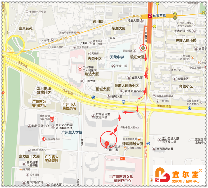 地鐵:1號(hào)線與3號(hào)線的體育西路站G出口,面向馬路,往右邊華夏路方向直走,經(jīng)過(guò)華夏銀行—民生銀行,然后過(guò)人行隧道,隧道右邊往前走,到公交站牌后面就可見(jiàn)到保利克洛維廣場(chǎng)-中盈大廈,珠江婦幼北門對(duì)面,如下圖